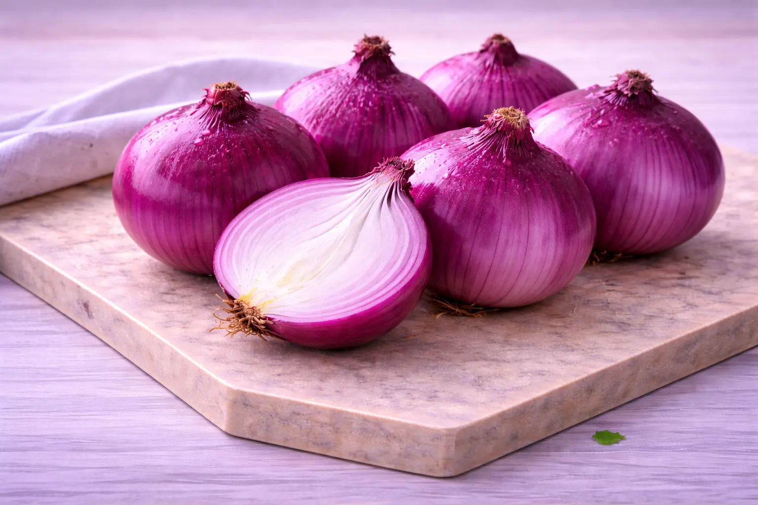 La cebolla roja también es conocida como cebolla morada. Es dulce con un ligero toque picante. Su piel es blanca y tiene buena conservación.